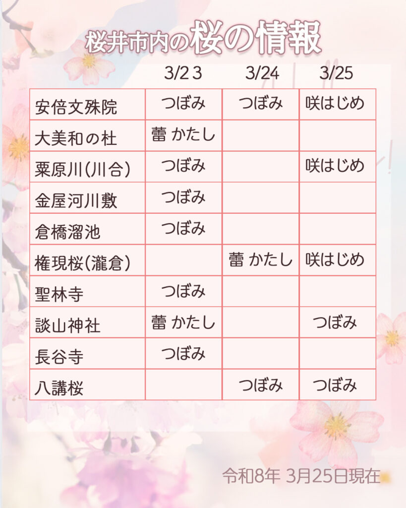 2026桜の開花情報 Cherry blossom information 2026年 桜の開花情報 2026.03.25.10:00 現在 権現桜(瀧倉神社(滝倉)) 前 次 粟原川(川合) 前 次 八講桜 前 次 大美和の杜展望台 前 次 金屋河川敷 前 次 倉橋ため池 前 次 ✅ 2025年の開花情報