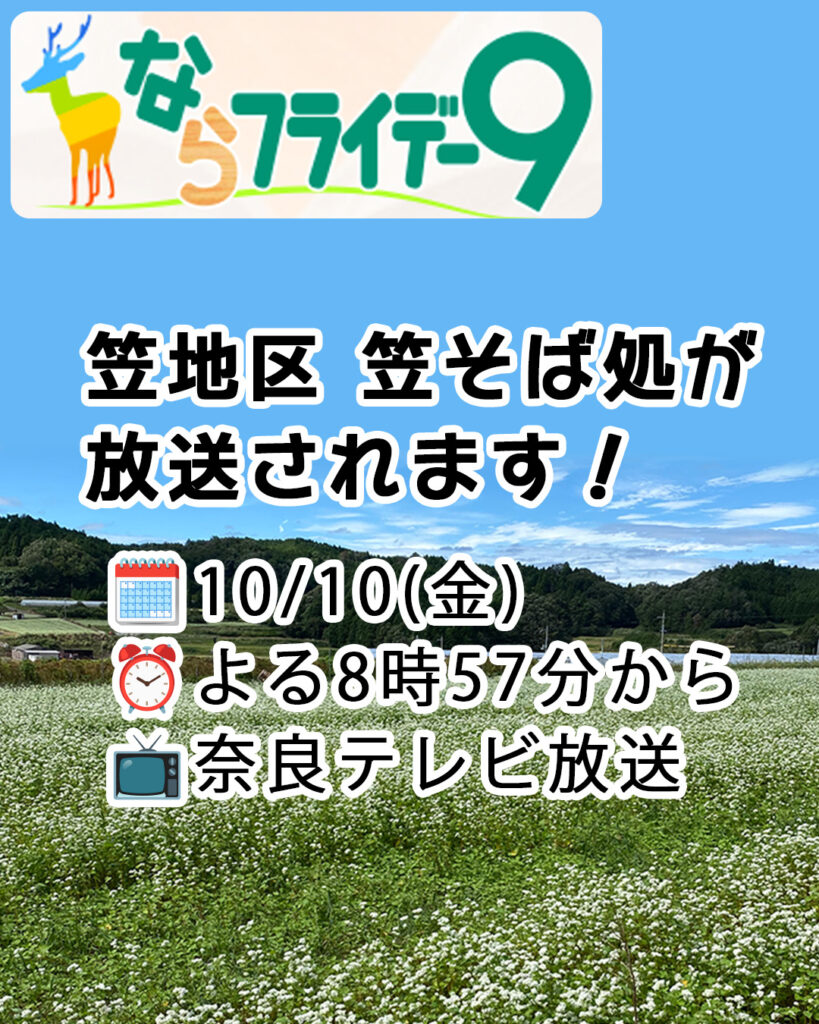 笠地区の笠そば処が奈良テレビ放送の番組「ならフライデー9」にて放送されます!